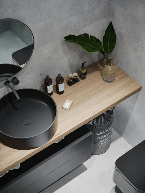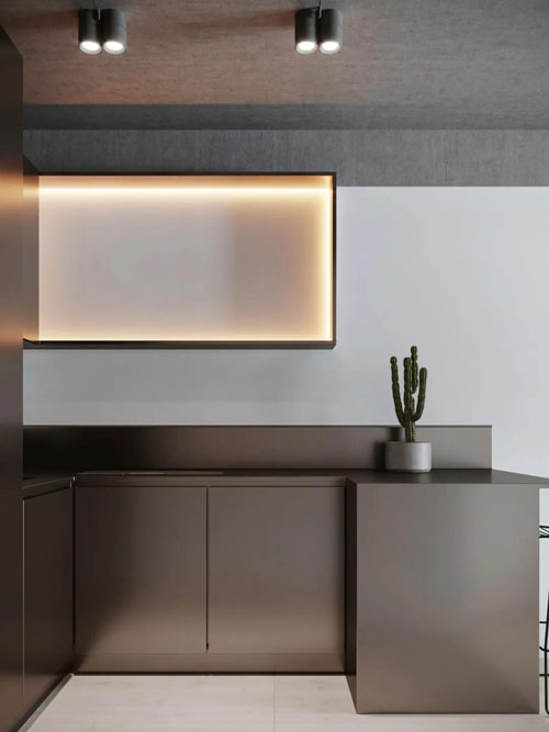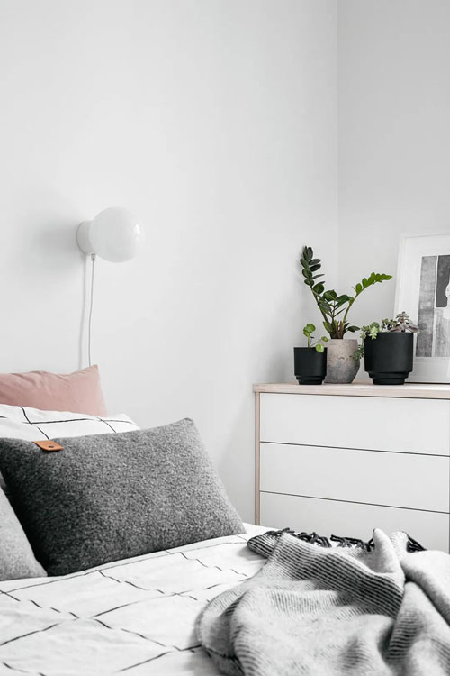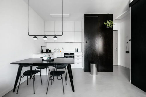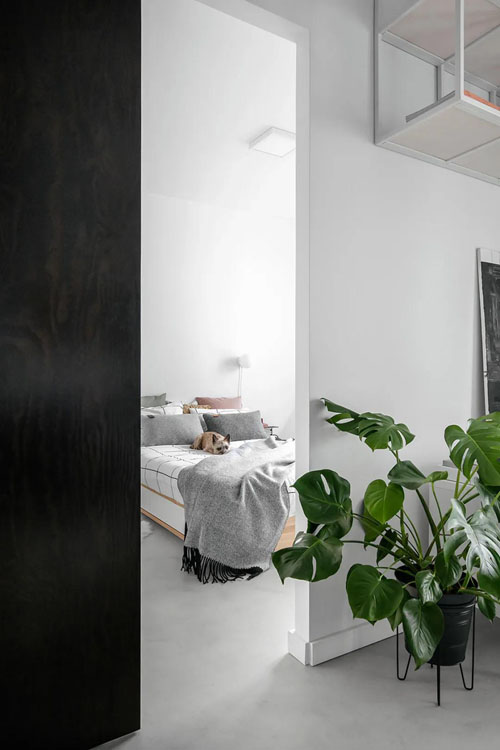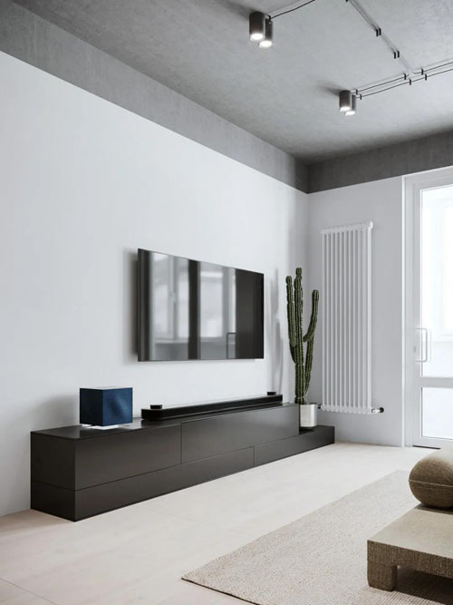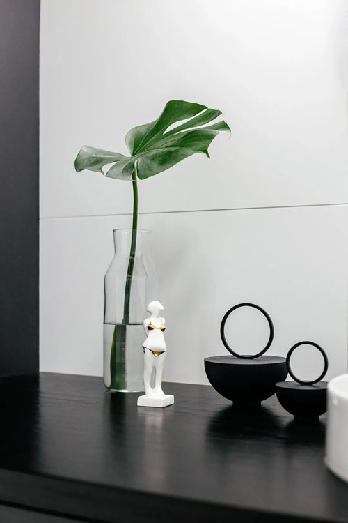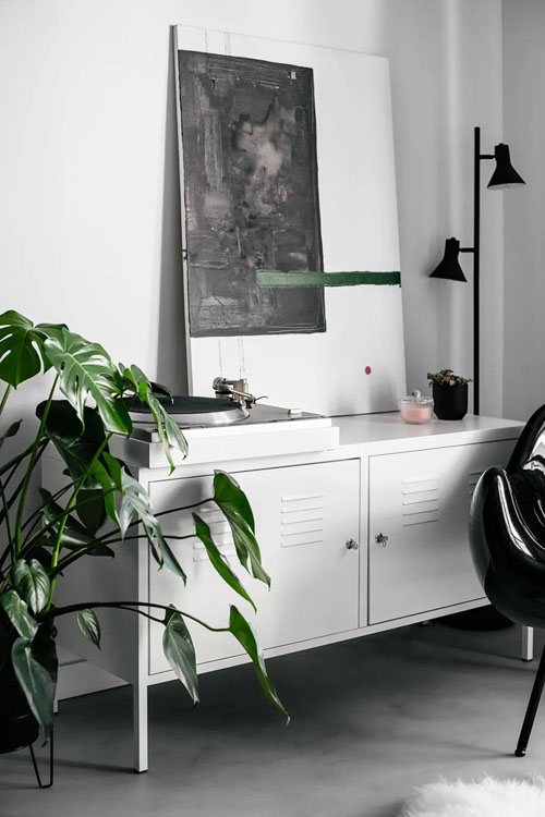 綠植擺放把黑色空間拉到一面墻的存儲白色柜子