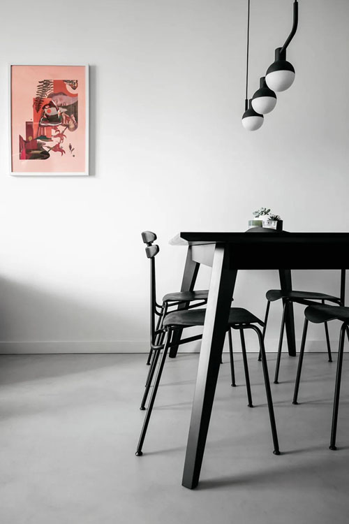 黑色吊燈與黑色金屬框餐椅相輔相成