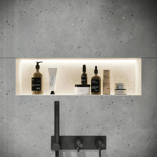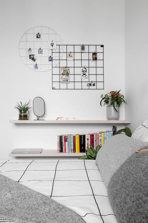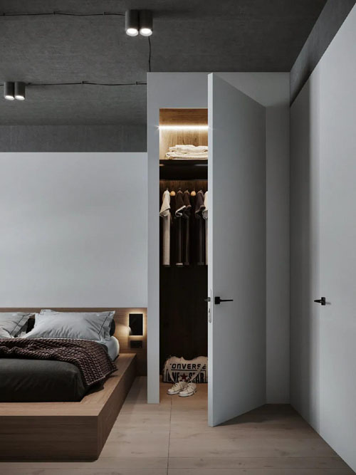 一個木制衣柜在漂浮的書架旁邊落在壁龕里
