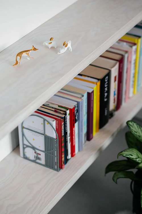 一個小狐貍雕像狡黠從兩個浮動書架的其中一個上滑過