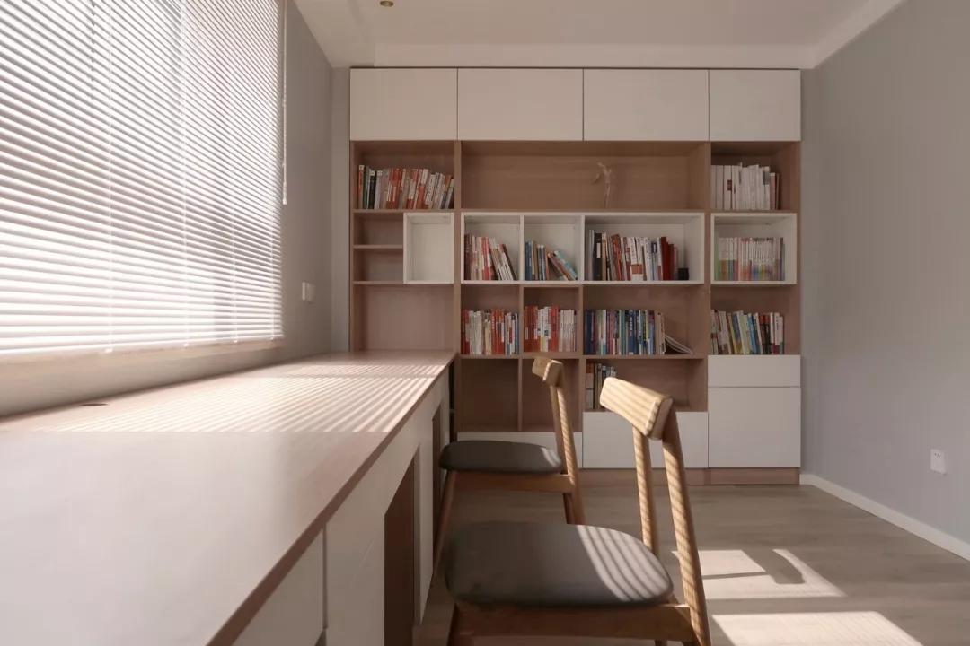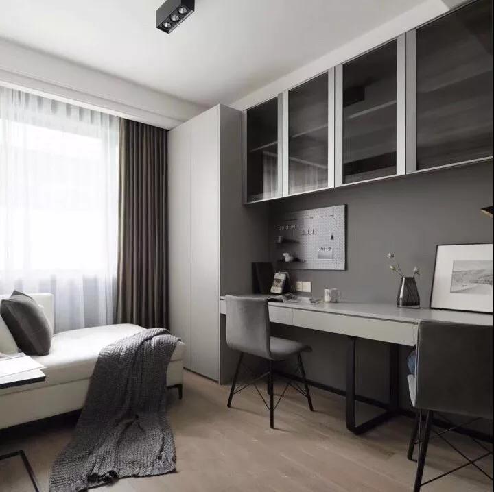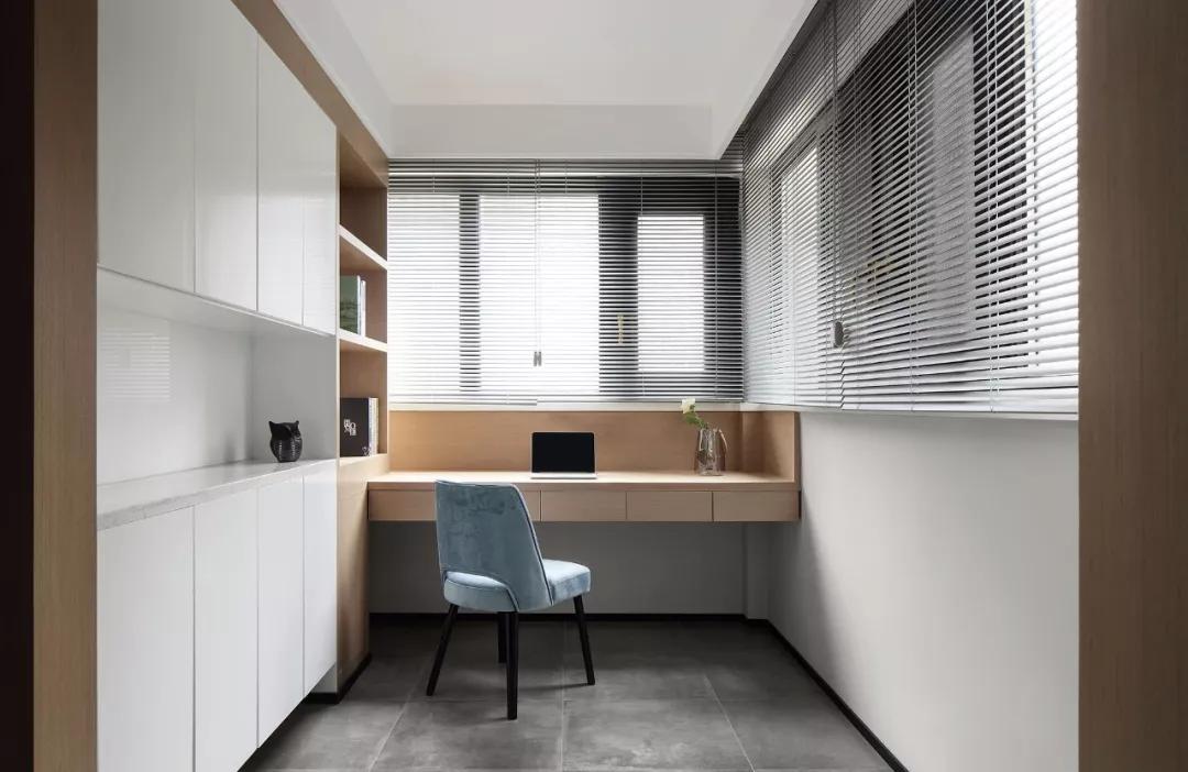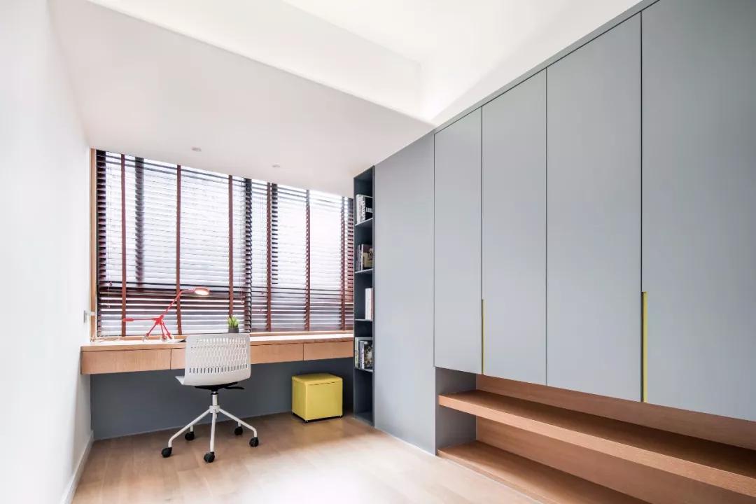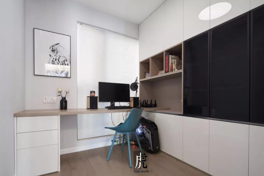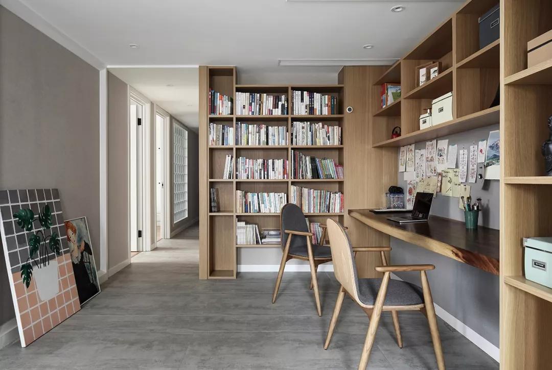 在定制收納柜的末端,交錯地裝上書桌,這樣讓空間的利用更加透徹,最大化地實現收納與辦公的空間。