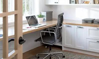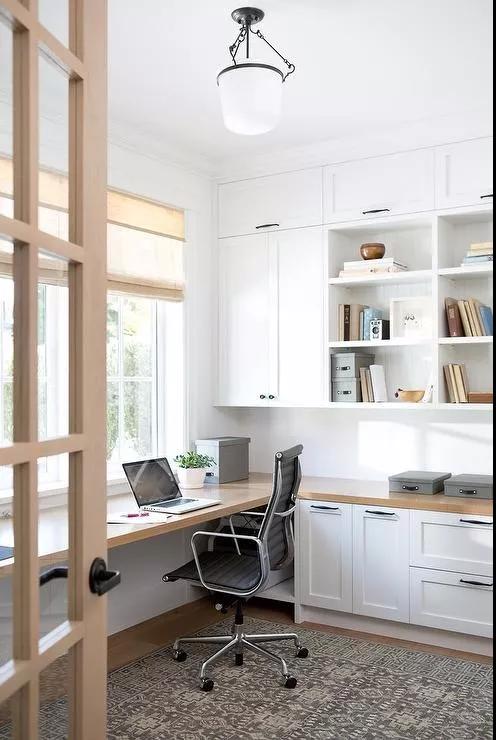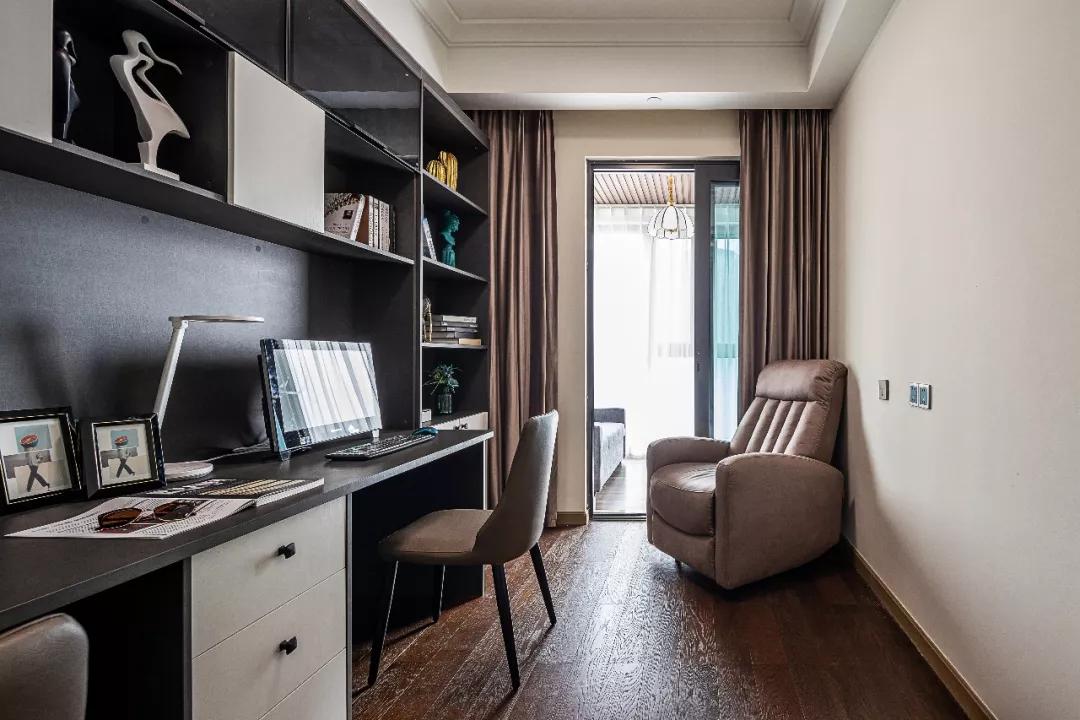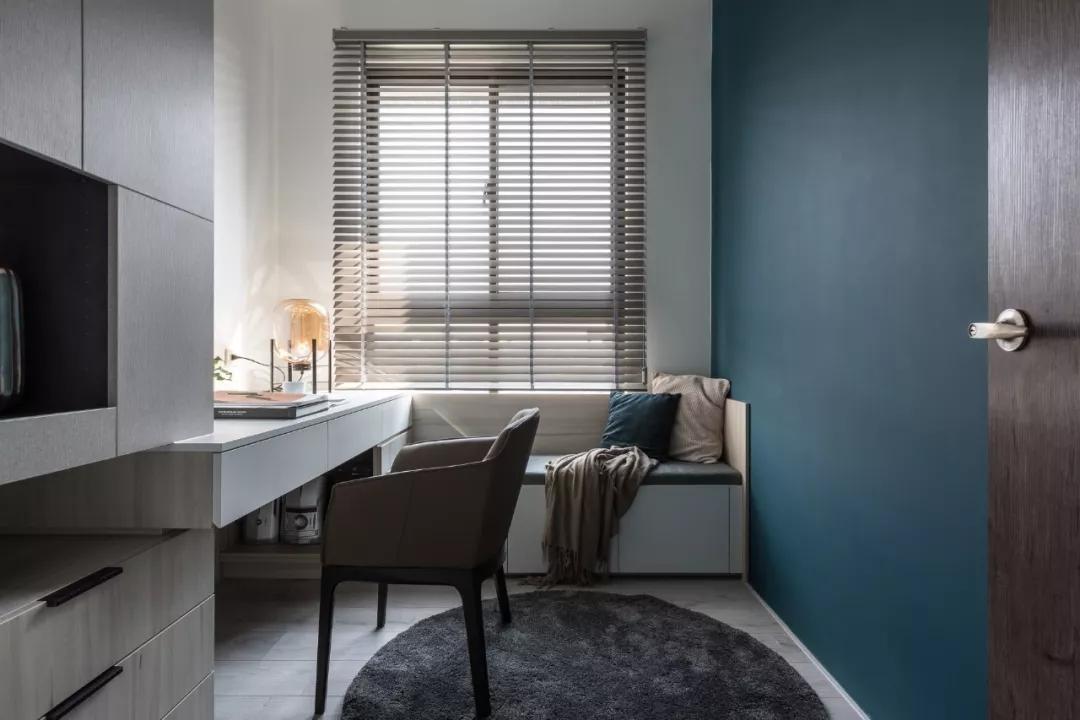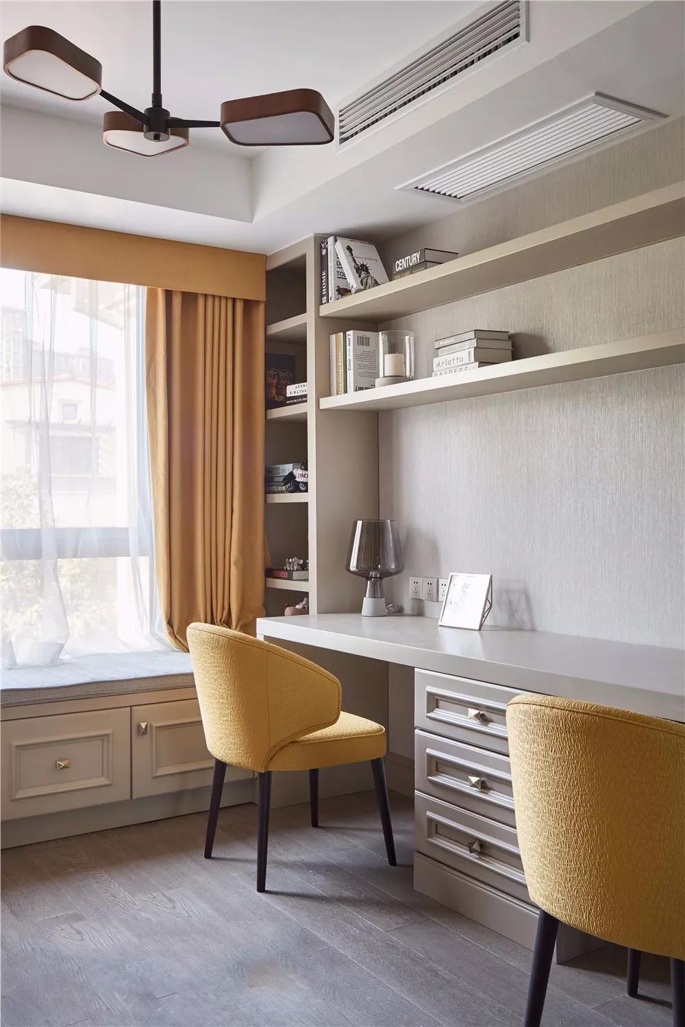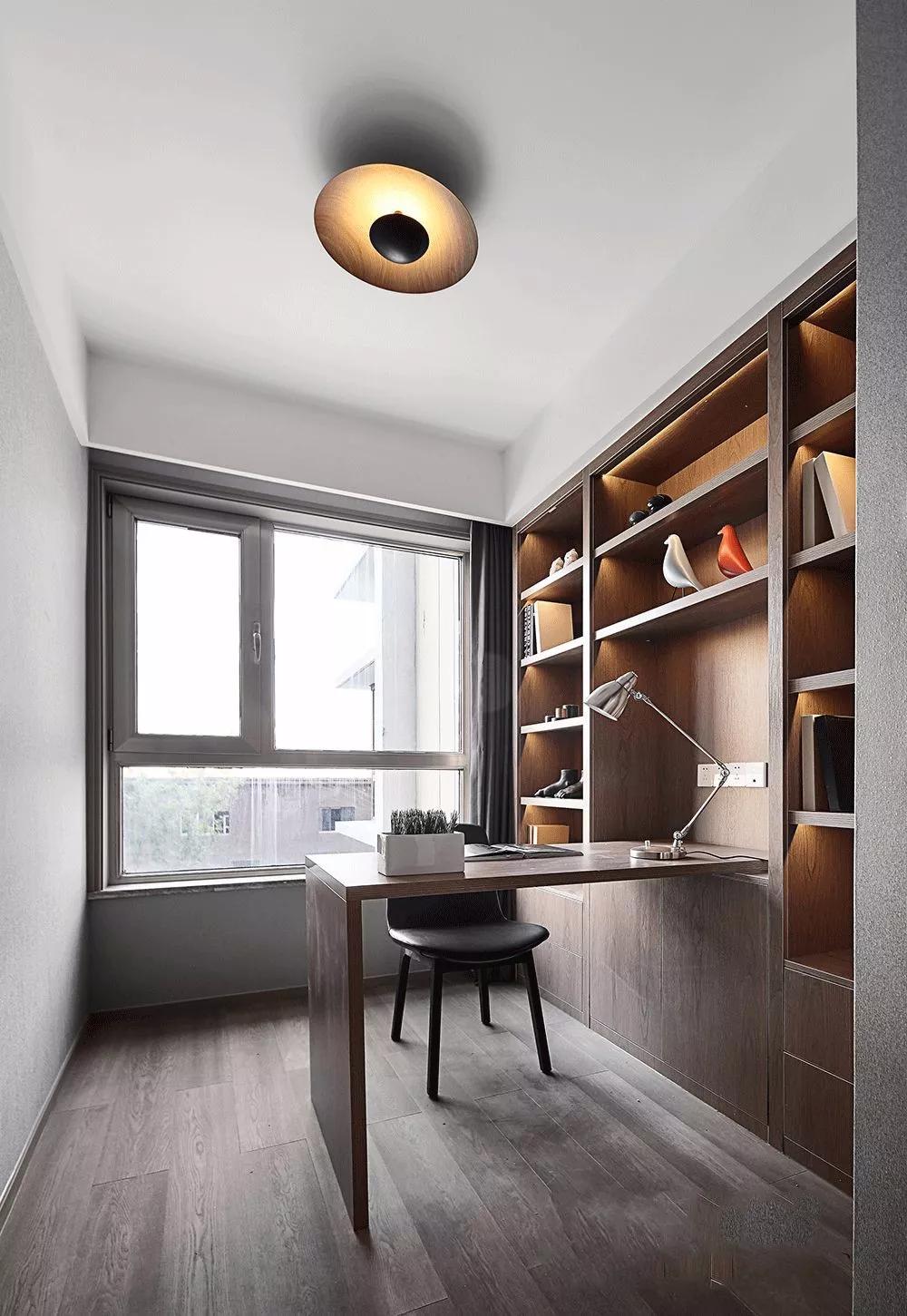 在定制收納柜的末端,交錯地裝上書桌,這樣讓空間的利用更加透徹,最大化地實現收納與辦公的空間。