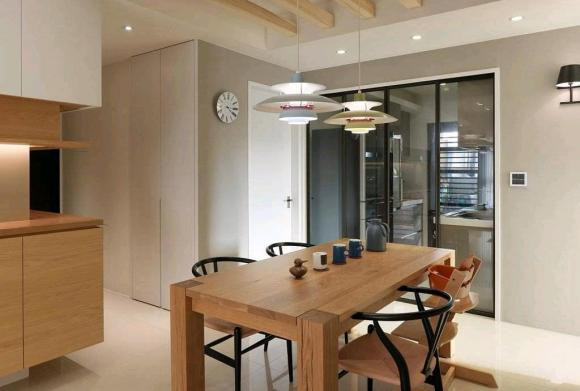 餐廳的燈具感覺很有氛圍感,餐廳做了柜子,增加一些收納容量。