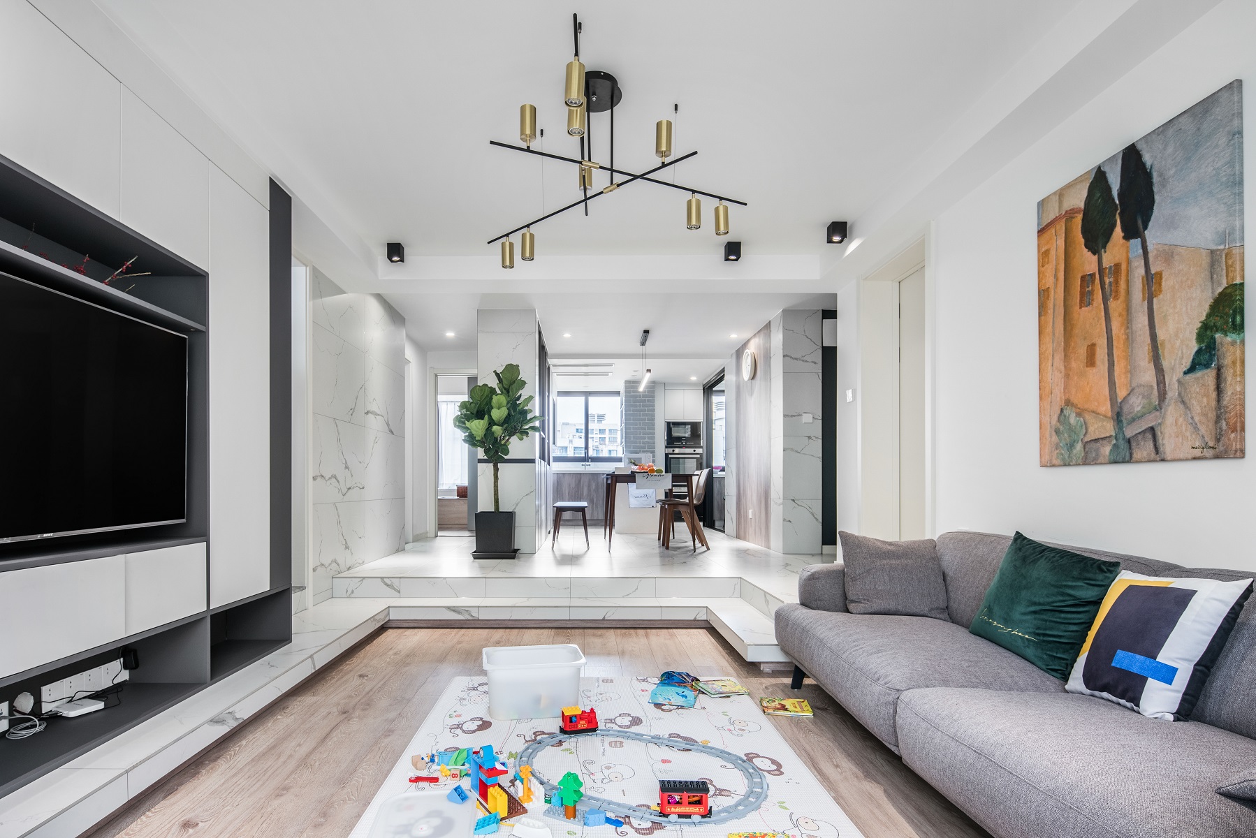 下沉客廳可以借助地面抬高和下挖兩種方式實現。比如你家是別墅或自建房的話,可以下挖40cm左右,與原始室內地面形成高低差,實現下沉客廳。但如果你家是二層以上的小區房,那么下挖的方式就行不通了。