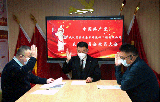會議在雄壯的國歌聲中拉開帷幕,中共武漢市裝飾建材家居發展商會支部委員、武漢思索未來家居裝飾工程有限公司總經辦主任戴惠芳同志宣讀了中共武漢市硚口區委韓家墩街道工作委員會《關于同意成立中國共產黨武漢思索未來家居裝飾工程有限公司支部的批復》文件。會議嚴格按照民主選舉程序,采取無記名投票方式進行等額選舉產生了中共武漢思索未來家居裝飾工程有限公司第一屆支部委員會書記沈萬軍同志。沈萬軍在發言時說,乘著黨的二十大的強勁東風,在全黨全國上下興起學習宣傳貫徹黨的二十大精神熱潮之際,公司成立黨支部具有十分重大的意義。長期以來,公司一直堅持“向黨學智慧,向部隊學管理”理念,作為第一屆支部書記,必將切實履行職責,在上級黨組織的領導下,認真貫徹黨的方針政策,不斷吸收和發展新黨員,與黨同心、與時代同步,積極營造和諧穩定的內部環境,努力將公司打造成為國內一流的大家居服務商平臺,為企業的發展保駕護航。隨后,還健全了支部組織結構,并就支部未來各項工作的開展進行了討論交流。在沈萬軍同志的帶領下,全體與會黨員重溫了入黨誓詞。