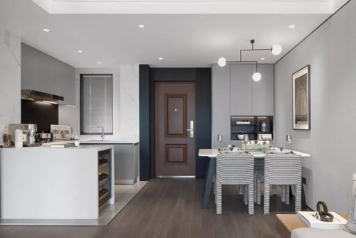 進門右側是廚房,左側是餐廳,采用開放式的設計,緩解入戶的壓抑與空間的局促感。