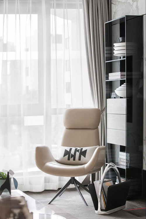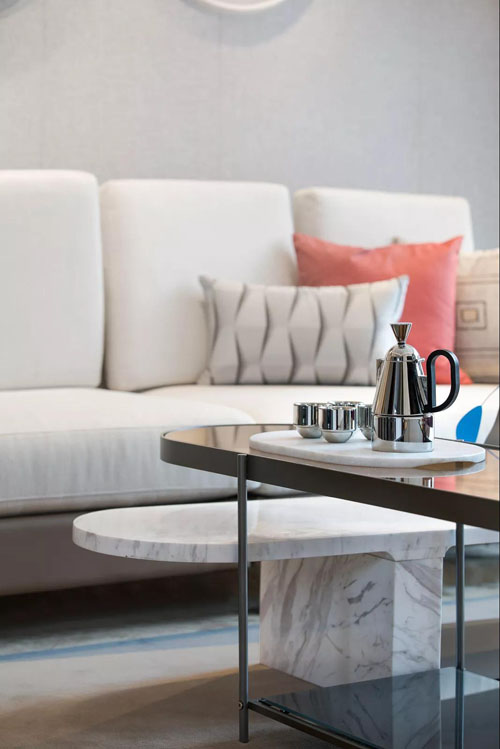 在深淺不一的灰調空間里,設計師巧妙的以珊瑚橙做為點綴,恰好有種深海的隱喻,色彩撞擊碰撞出新鮮活力,浪漫時髦的都市情調惹人心動。