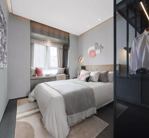 主臥以淺灰色為主色調,通過深色地板和衣柜來實現空間輕與重的平衡。黑色玻璃衣柜,增加了空間的通透感,又避免了凌亂的視覺感。