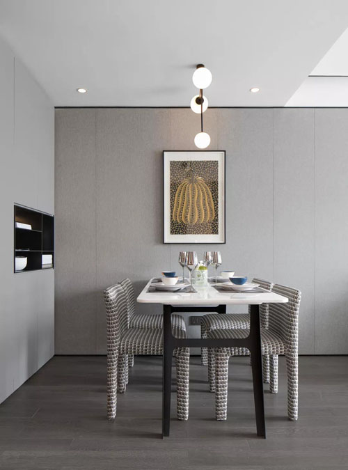 沙發硬包背景一直延申到餐廳,提升空間的溫馨舒適感。入墻式定制柜,滿足了入戶及餐廳的收納需求,適當的留空,不會顯得過滿,時尚而靈動。