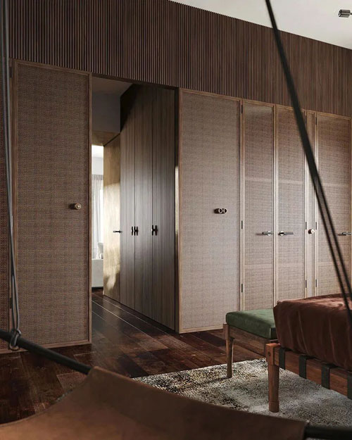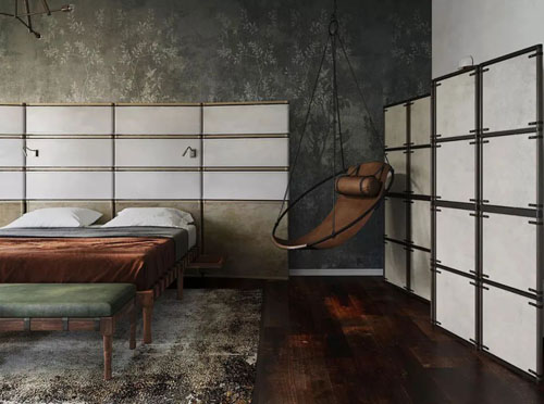 臥室內的設計別具一格,絨制的床頭和地毯加上白色墻壁搭配木色的地板和衣柜,營造出了一種來自大自然的高級感,吊椅為端莊高級的臥室增添了一絲輕松活躍的氣氛。