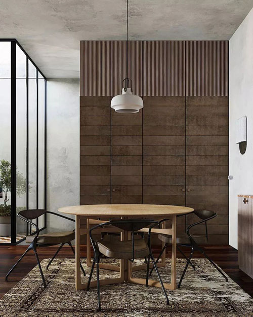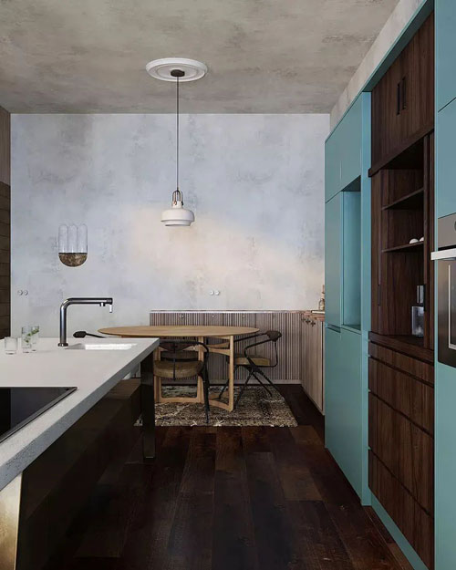 住宅整體色調以木色為主,在開放式廚房中用綠松石色的櫥柜作點綴,給室內空間提供了他溫馨且明亮的視覺效果,用柔和的色調和清晰的線條打造內斂美學。