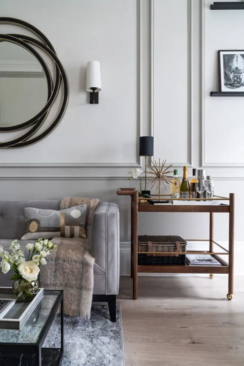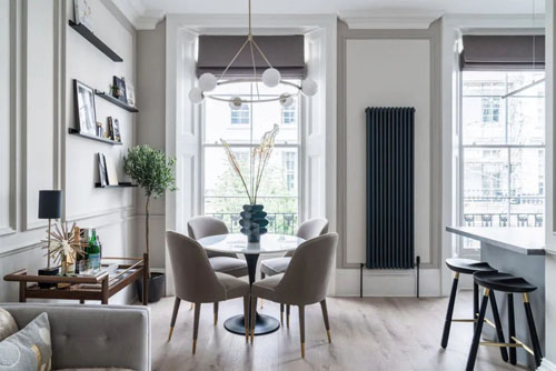 這個諾丁希爾一居室公寓位于倫敦市中心,套內面積47㎡,由Olga Ashby設計。這是典型的維多利亞式建筑,層高很高,空間不顯壓抑,三個法式大窗戶使得室內采光很好,設計師在這樣的空間可以讓自己的設計得到更好的發揮。