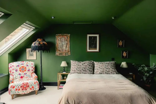 如果你想用綠色營造充滿正能量的空間氛圍,那么全刷上綠色也無妨。在冷色調、灰色系與自然綠背景下,點綴質樸的木色,也能營造視覺亮點。加上經典的臺燈、家具,又彰顯了復古風格。