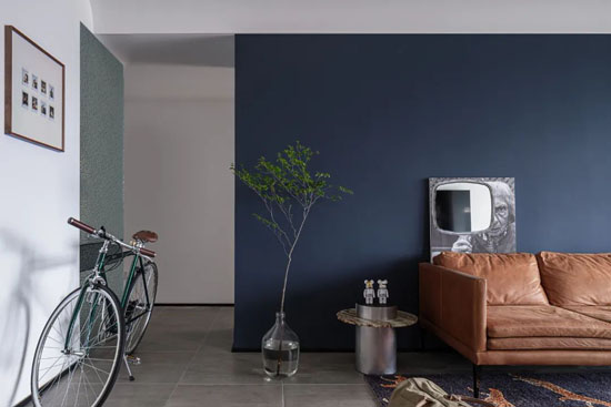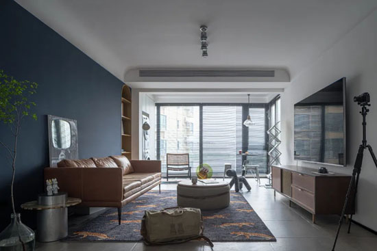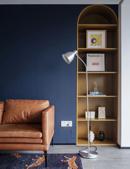 神秘深邃的藍色作為沙發背景,配上搞怪的鏡子元素和充滿生氣的綠植,也是意外的和諧舒適。