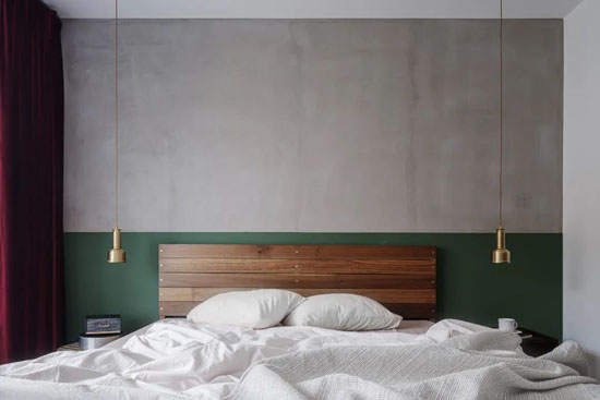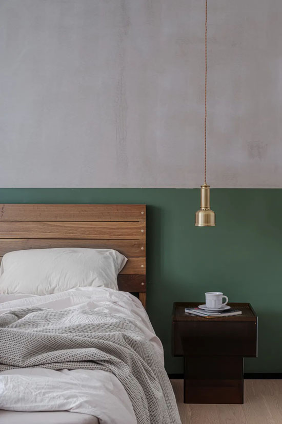 臥室采用綠色及灰色的搭配,呼應空間主體的同時,能夠將深色系木制床襯托的更具有質感。