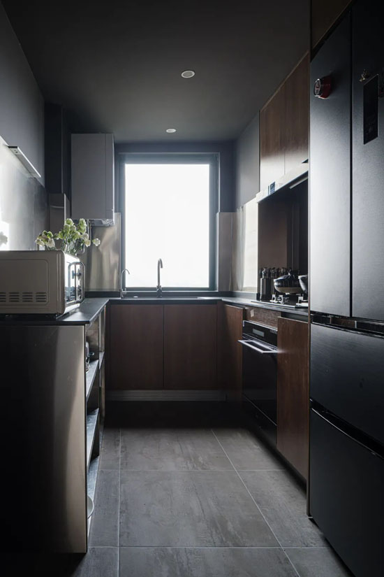 接近黑色的廚房頂面、深色木飾面、不銹鋼墻面飾面以及不銹鋼臺面,無一不體現了屋主的獨特喜好,每一個元素獨立存在卻能很好的結合在一起。