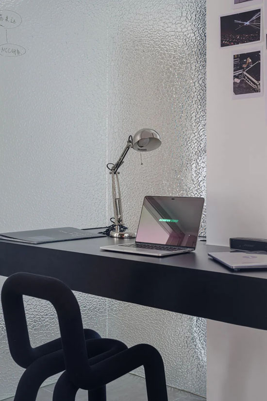 書房與客廳之間的橘皮玻璃能夠滿足辦公時與客廳之間相對獨立的功能需求。