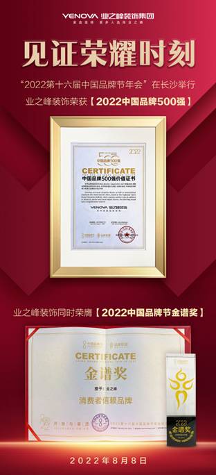 業(yè)之峰裝飾曾經(jīng)榮獲“2022中國品牌500強”和“2022中國品牌節(jié)金譜獎”