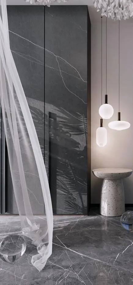 衣帽間部分,灰色和白色是空間中的主色調(diào)。白色大理石桌子和灰色的時尚座椅相互搭配,給人柔和的視覺感受。衣柜部分,同樣使用了灰色的元素進(jìn)行裝飾,營造出優(yōu)雅的美感。吊燈的造型頗為華麗時尚,進(jìn)一步烘托了空間的氛圍。
