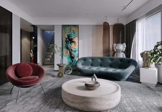 客廳部分,設(shè)計師選擇了灰色的地毯進(jìn)行地面的鋪陳,富有質(zhì)感的紋理,增強了空間的特色。沙發(fā)的選擇上,藍(lán)色的長款沙發(fā)搭配紫紅色的單人沙發(fā),營造了舒適的休閑體驗。圓形的大理石材質(zhì)的茶幾體現(xiàn)了個性化的特點。