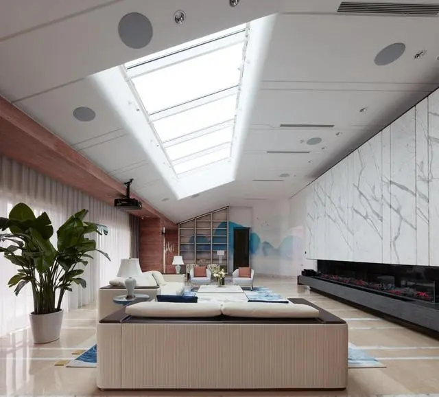 在整體的頂層休閑空間是比較大,而且空間頂部也是不規則的。其實這樣的設計主要是配合影音室的功能。空間利用投影儀,然后投影到墻面上就能夠展現出比較合適。在整體的估計效果方面主要是以休閑娛樂為主,所以在功能布局方面都是比較輕松的,給人一種意料又漂亮的感覺。