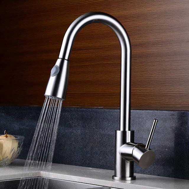 廚房抽拉式水龍頭也是不可缺少的,對比一般的水龍頭,抽拉式更加的靈活,抽拉式水龍頭有兩種出水方式,花灑和水柱,花灑一般有點沖勁,洗碗、洗菜的時候很方便,可以直接把表面的油污沖走,另外洗水槽也很方便。