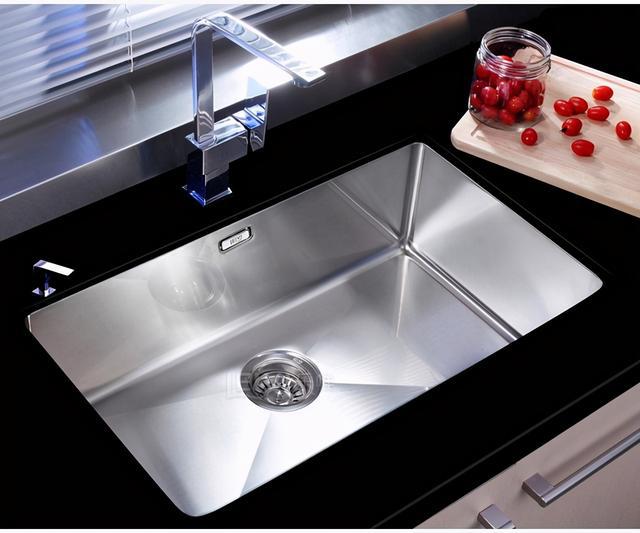 水槽使用大單盆比雙盆好用,可以放下炒鍋、油煙機過濾片等大件物品,清洗的時候不會把廚房弄得到處是水。另外,水槽安裝成臺下盆更方便,臺面上的水可以直接掃進水槽里。