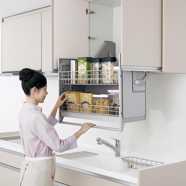 升降式拉籃對于身材嬌小的女主人來說,可算是最大的福音了,為了增加廚房的收納,通常都會選擇做吊柜,并且很多朋友家里吊柜都是做到頂的,收納無疑增加了,但是對于身材嬌小的女主人來說,拿東西就未必方便了,太高踮著腳都夠不著,裝升降式拉籃就很好地解決了這方面的尷尬了,只需把底部拉一下,拉籃整體高度都下降了,這樣就方便拿放用品。是不是提升了幸福感呢?