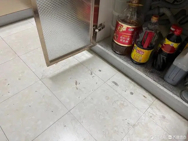 發現水跡的櫥柜平臺離地板將近十公分,上面擺放著醬油、醋等廚房調料用品。嚴先生的妻子介紹說,自防水補漏工人工作之后現場一直保留著,從未打掃過地面,也是今天才發現地磚已經開裂。