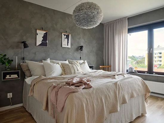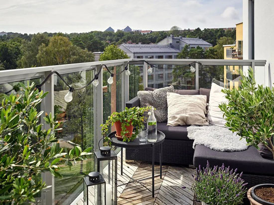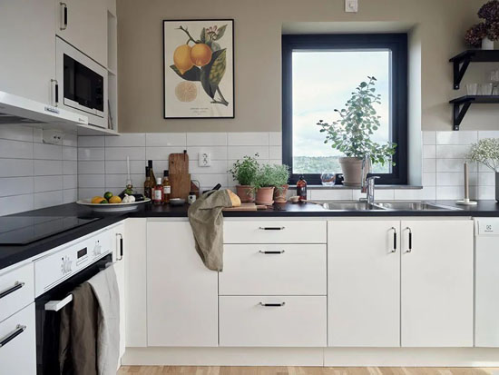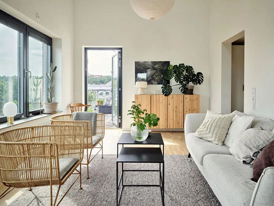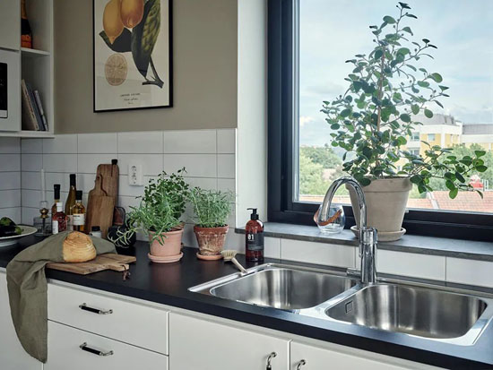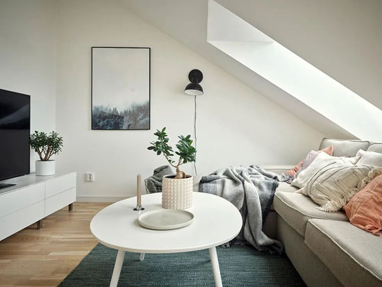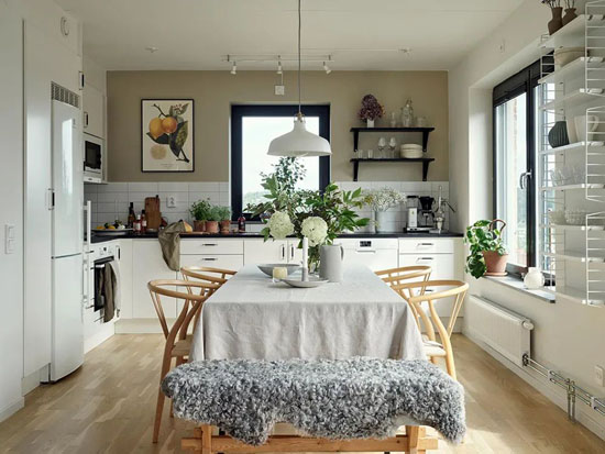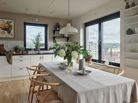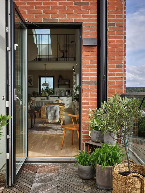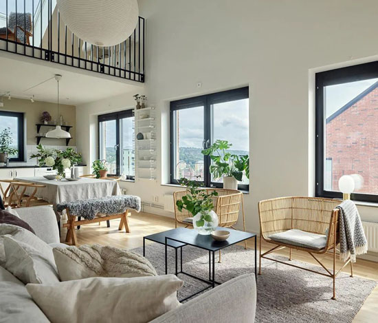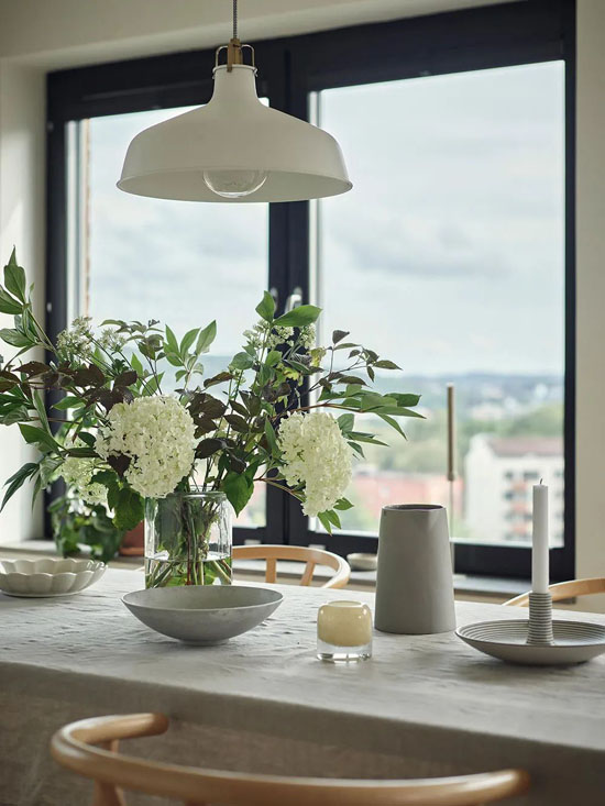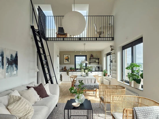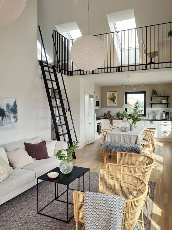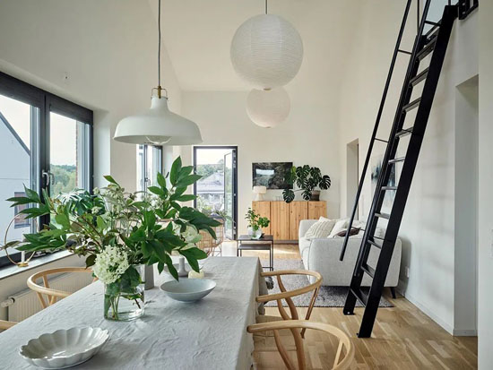 公寓整體采用淺色北歐風格色調裝飾,閣樓欄桿、梯子、配件和窗框上的黑色細節大膽地打破了這些色調。位于房屋頂部的位置意味著可以欣賞到 Högsbo 的廣闊景色,并以 Slottsskogen 和 änggårdsbergen 為背景。相反,大陽臺是全天享受陽光的最佳位置。