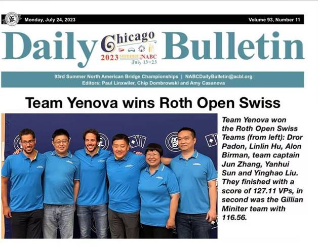 2023年7月,在北美橋牌夏季大賽上,由鈞哥領銜并作為主力隊員的業之峰橋牌隊成功斬獲瑞士制團隊賽冠軍。這是繼2018年在夏威夷北美秋季大賽后,業之峰隊再次摘得這一桂冠。